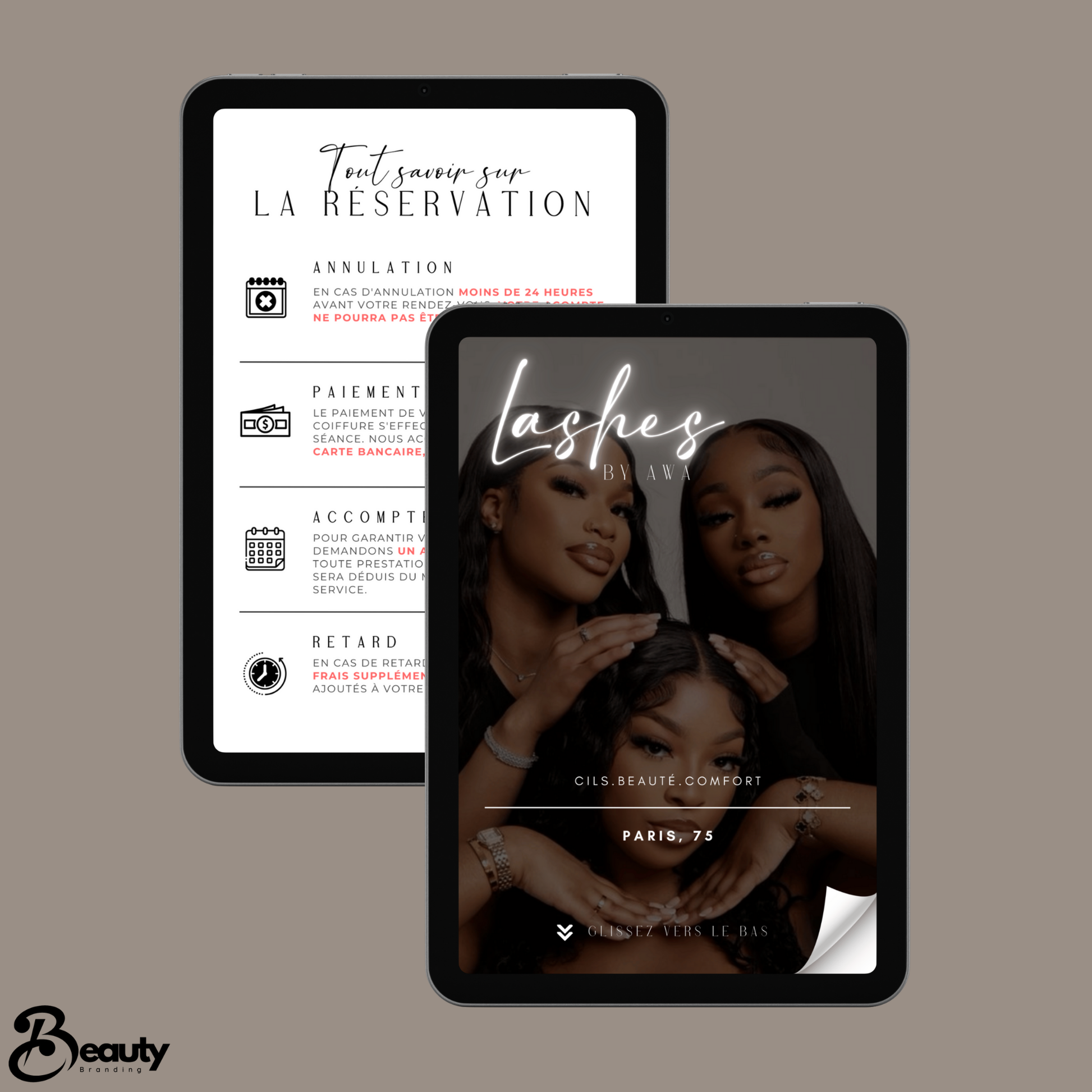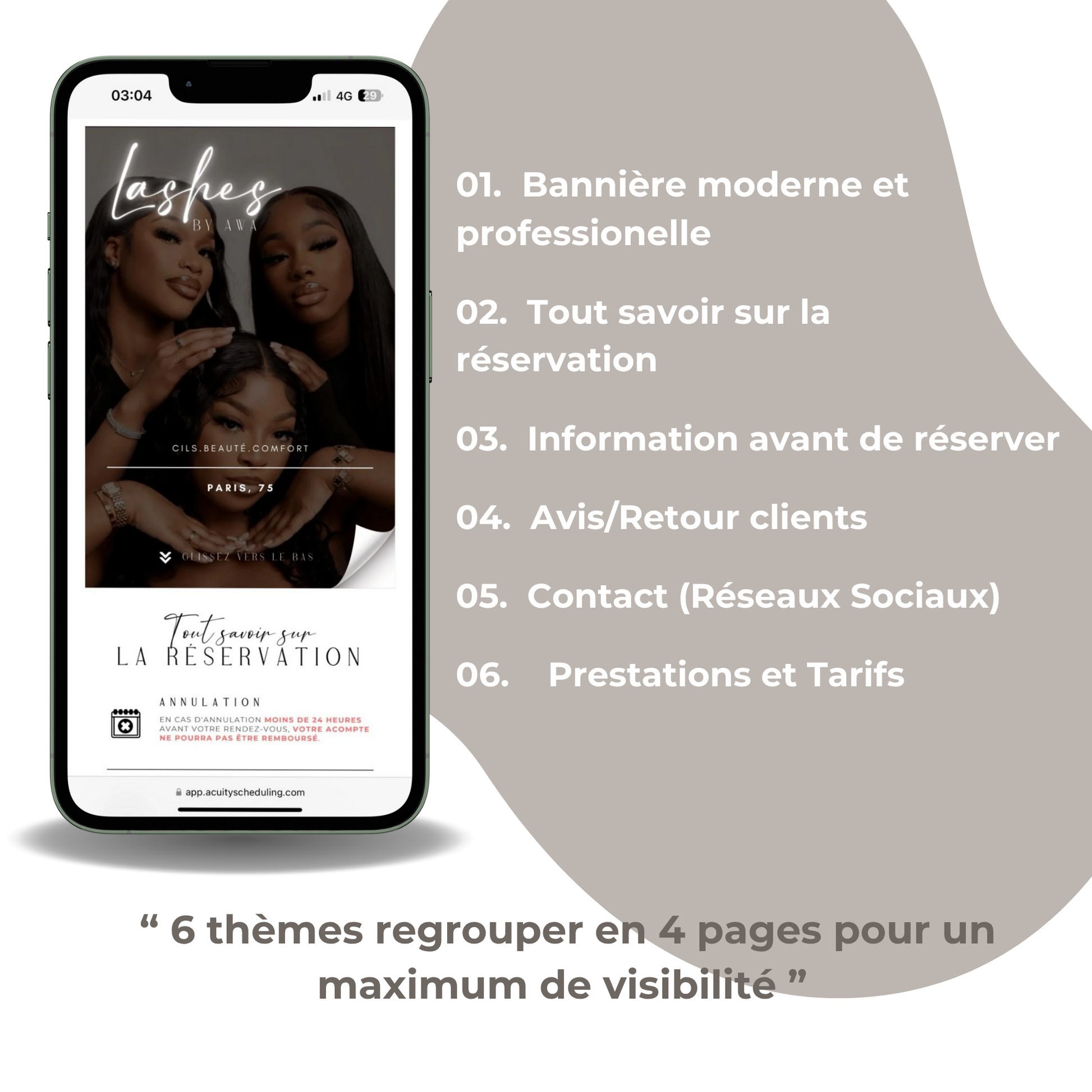 Ce modèle est conçu pour les beauty entrepreneurs souhaitant personnaliser leur page Acuity avec élégance et professionnalisme. Grâce aux créations Beauty Branding, offrez à vos clientes un aperçu exclusif de votre expertise tout en affirmant votre identité visuelle. Idéal pour se démarquer et marquer les esprits