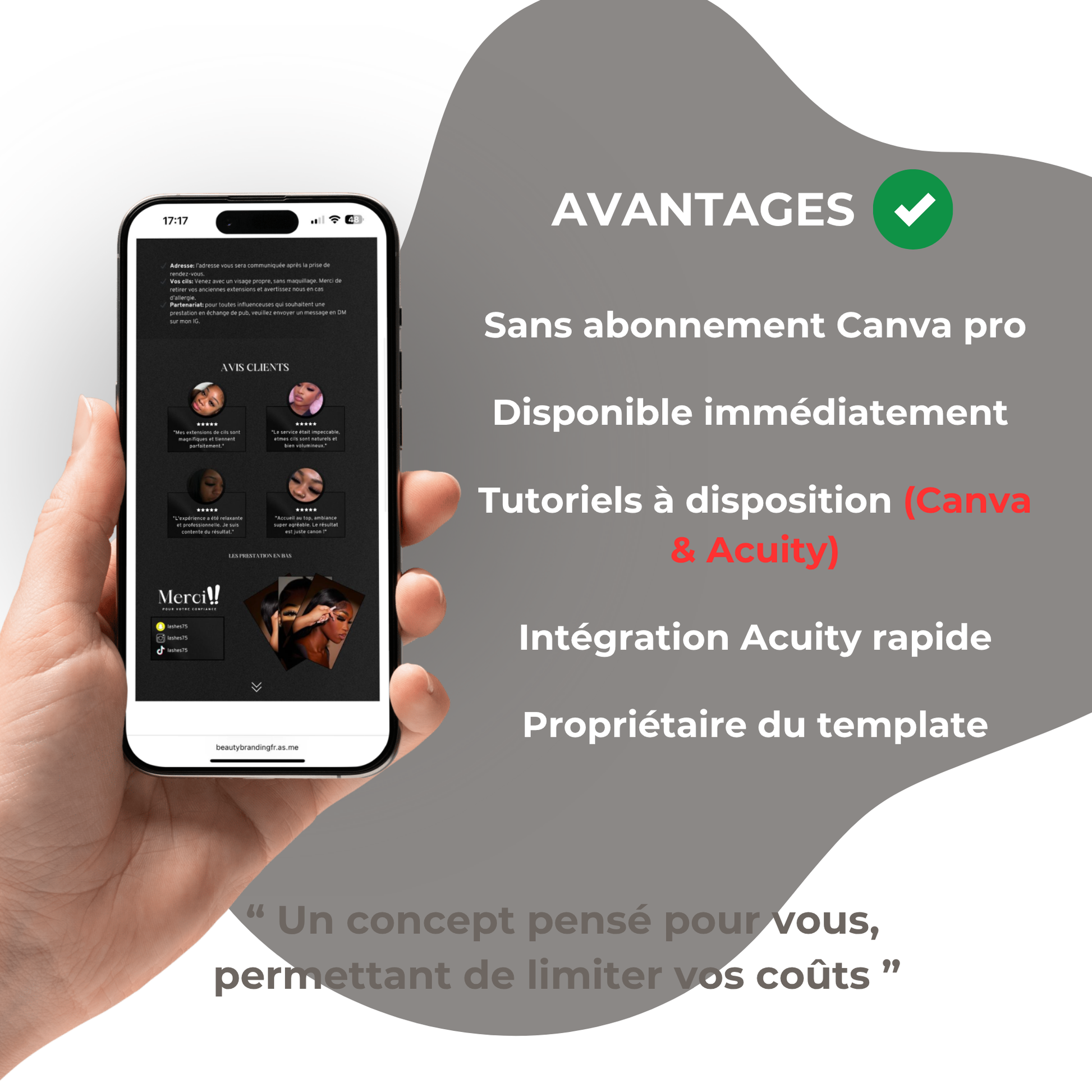 Personnalisez votre page Acuity avec élégance et professionnalisme grâce à nos templates 100% modifiables avec Canva. Offrez à vos clientes un aperçu de votre expertise tout en affirmant votre identité visuelle.