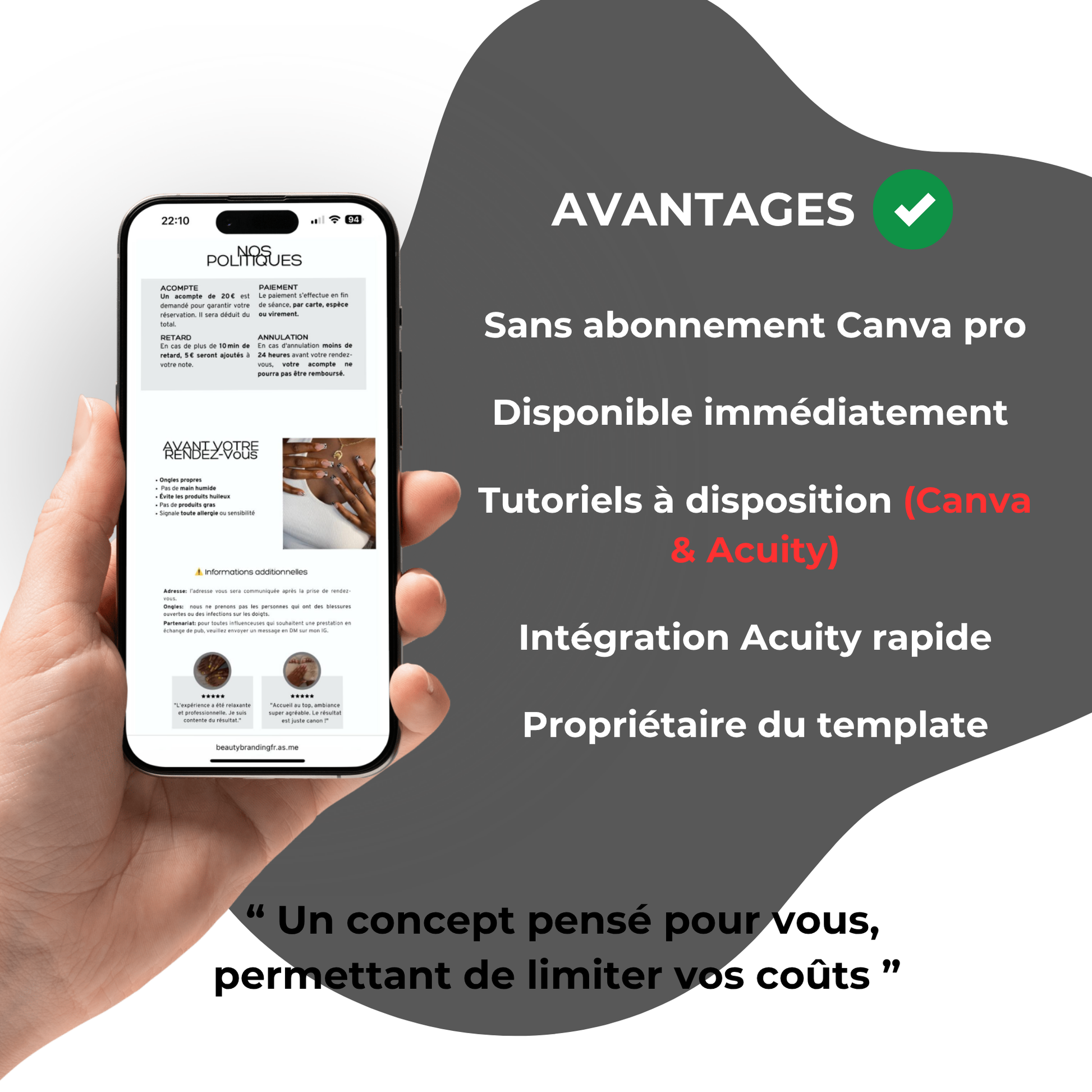 Ce modèle est conçu pour les beauty entrepreneurs souhaitant personnaliser leur page Acuity avec élégance et professionnalisme. Grâce aux créations Beauty Branding, offrez à vos clientes un aperçu exclusif de votre expertise tout en affirmant votre identité visuelle. Idéal pour se démarquer et marquer les esprits